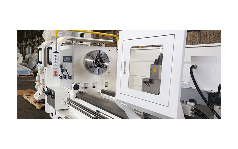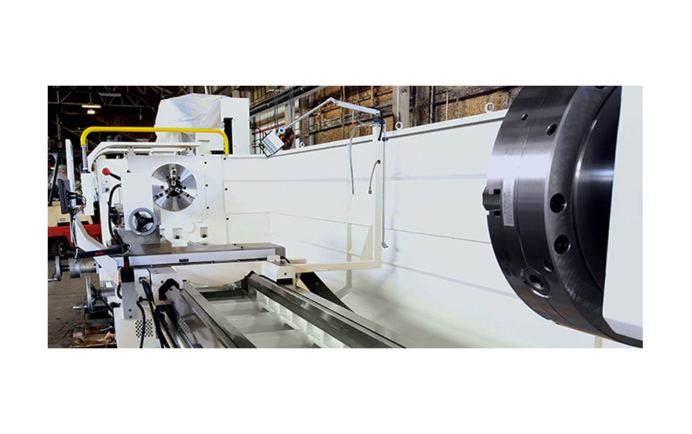 Summit® Big Swing Hollow Spindle Lathes (47″, 55″ and 63″) have set a new standard among machining tools in this size range with their unprecedented depth and combination of “standard” features. These lathes are designed to provide the precision and rugged reliability required for today’s demanding applications. The Big Swing Hollow Spindle lathes are available in center distances from 80″ to 600″ with spindle bores from 9″ to 21″ to cover a wide range of work pieces and feature castings that are heavily ribbed for rigidity and vibration dampening. The headstock is designed with straight cut final drive gears to provide quiet and efficient operation through the full range of spindle speeds. The extra wide (31.5″) bed ways are hardened and precision ground to provide high accuracy and long life and the bed is constructed from high-grade alloyed cast iron, normalized and aged to achieve maximum stability. An additional third way is provided on the front of the bed to provide additional support to the carriage to prevent deflection even in the heaviest cuts.